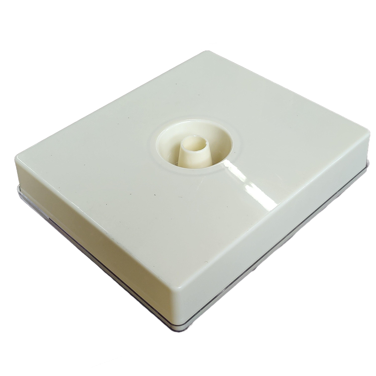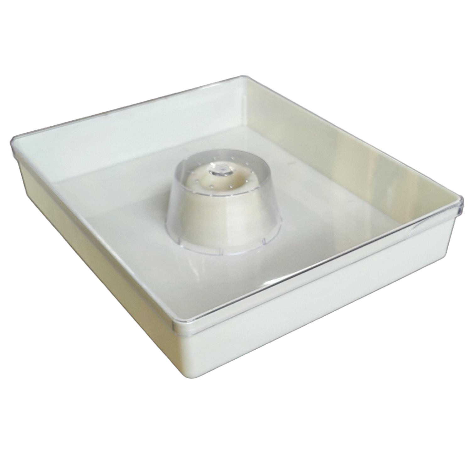 The feeder can sit over the inner cover or directly over the frames in a hive. Bees access the food through a hole in the bottom where they can feed on a small amount of syrup without having access to the whole container.