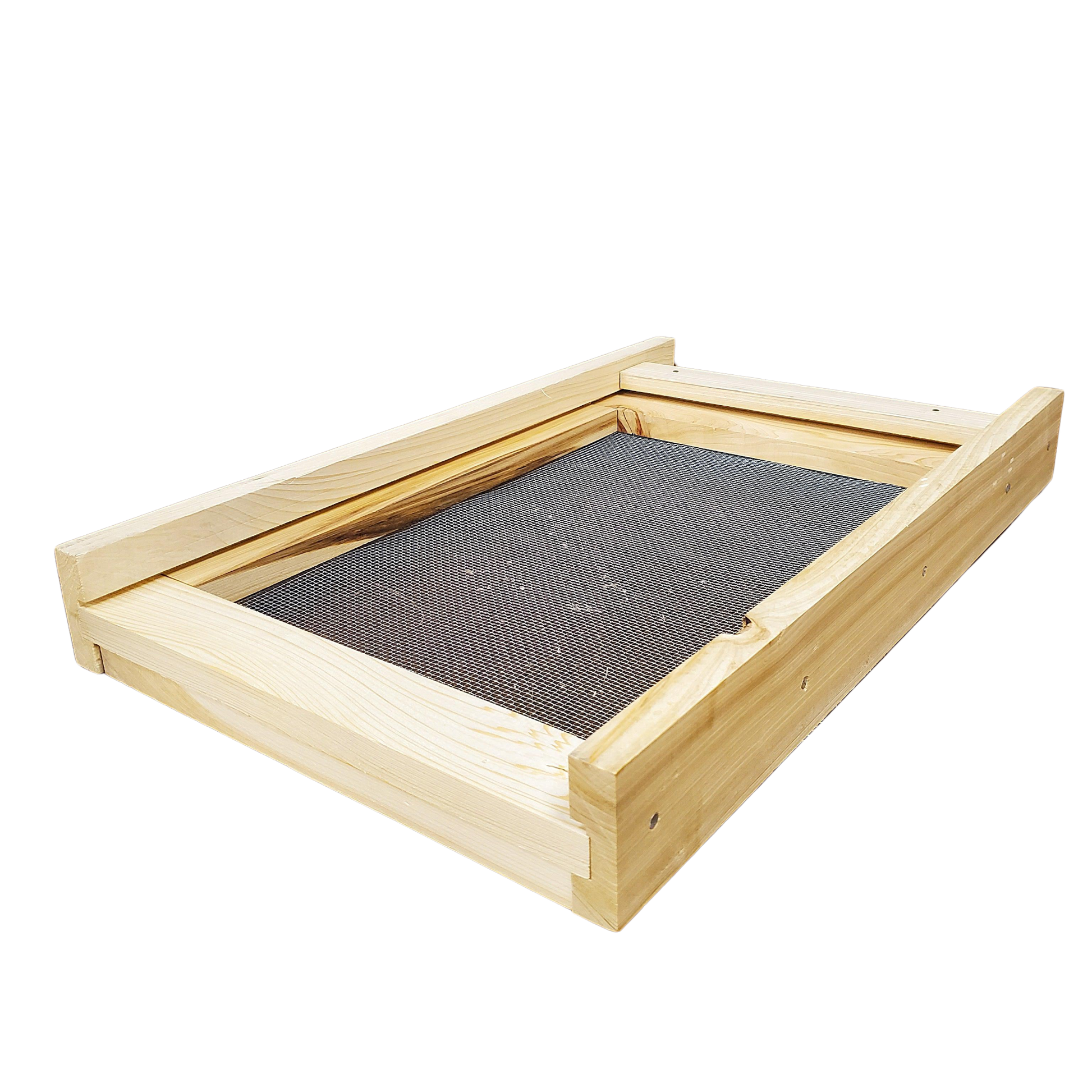 The screen on the bottom of the bottom board serves as a false floor that bees cannot get through, but debris and air can pass through easily. Our screened bottom boards also have a small rail underneath the screen where a corrugated board can rest. This corrugated board allows beekeepers to "close" the screen, reducing any drafts.