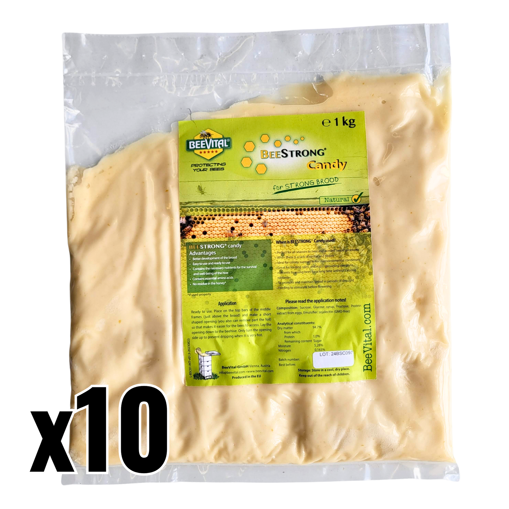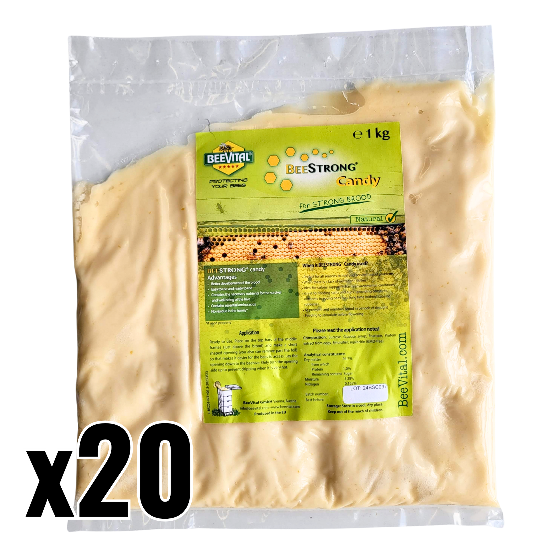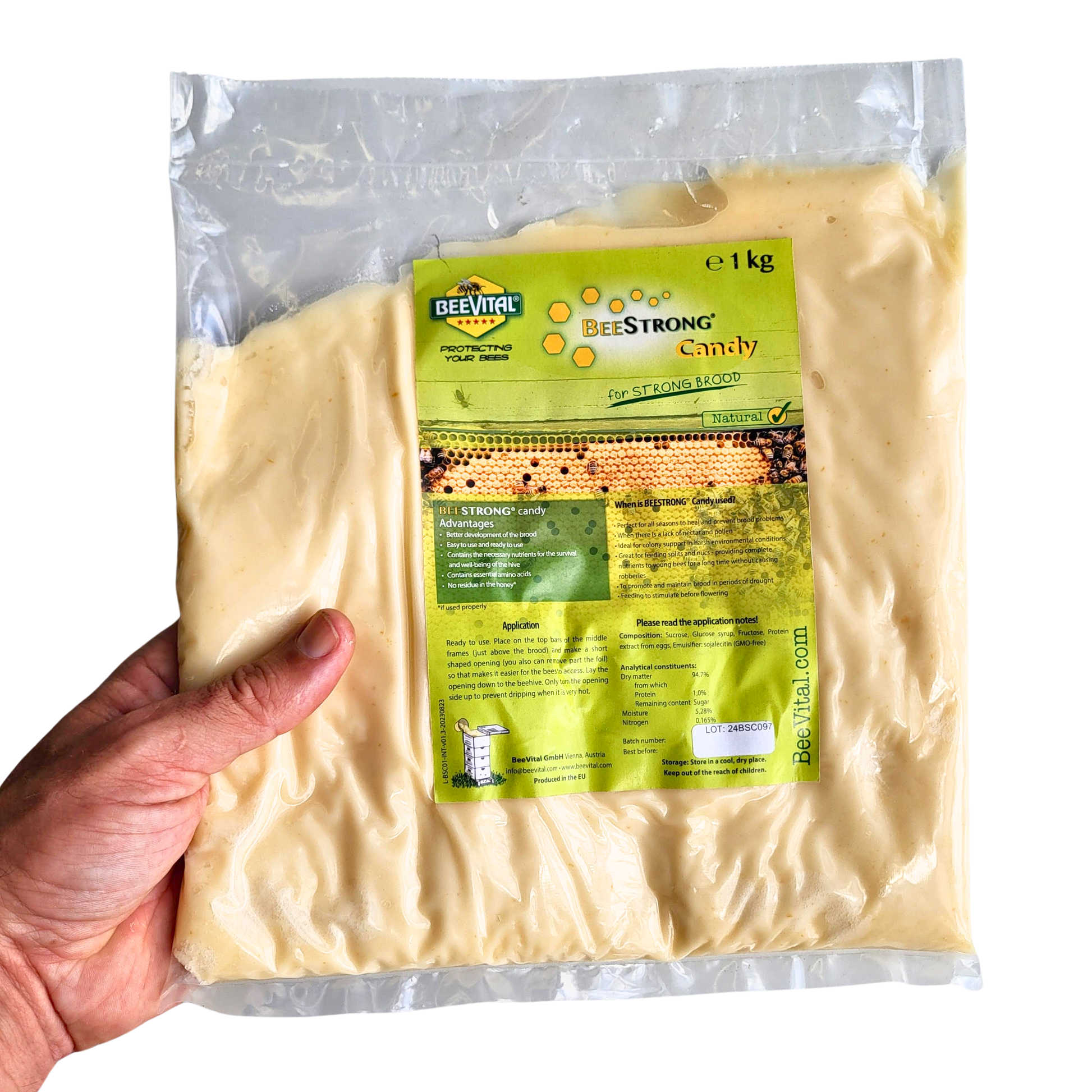 Placement: Position BeeStrong Candy on the middle frames, on the top bars, cut side down, making it easy accessible for the bees. The candy can be placed above the 1st, 2nd or 3rd box. Ideally it placed directly above the brood nest. Place covers back on the hive.