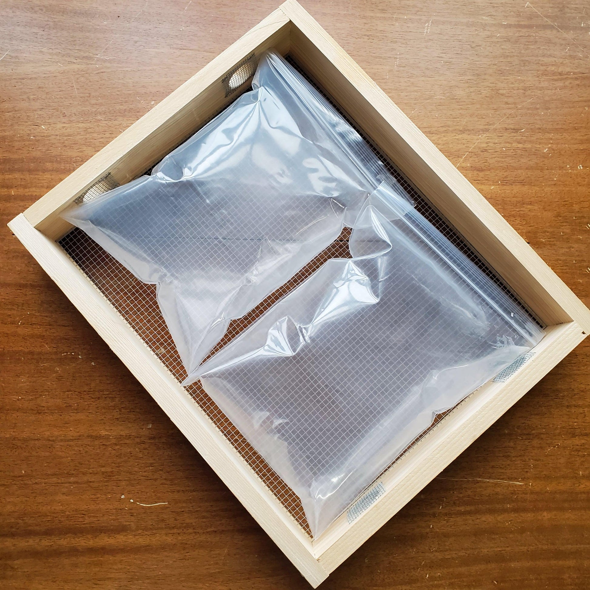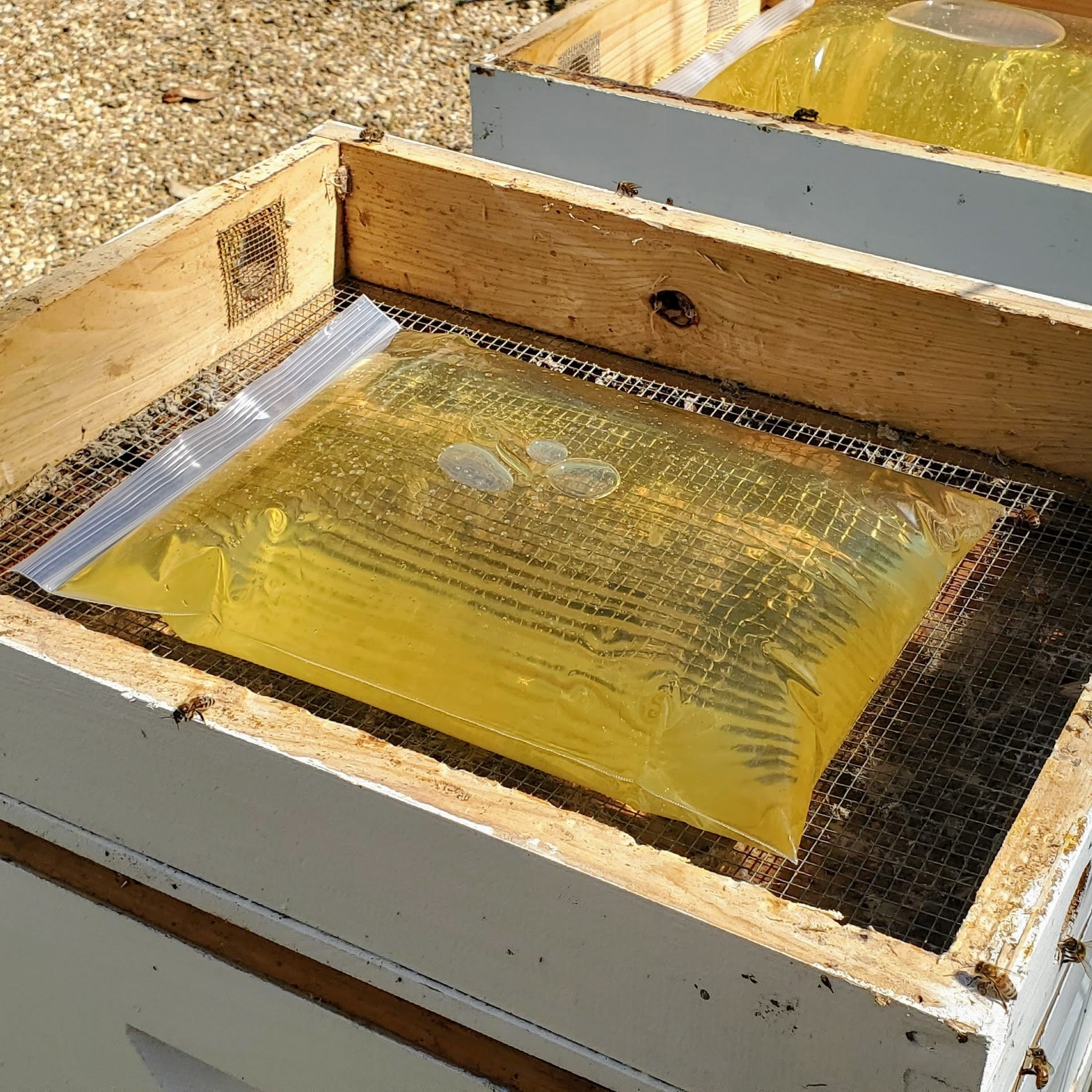 These feeders help give bees a higher volume of syrup without specialized equipment. Two bags can be placed inside an 8-frame box and a 10-frame box. While cutting a hole in a bag on top of your bees may seem counterintuitive, they do work very well.