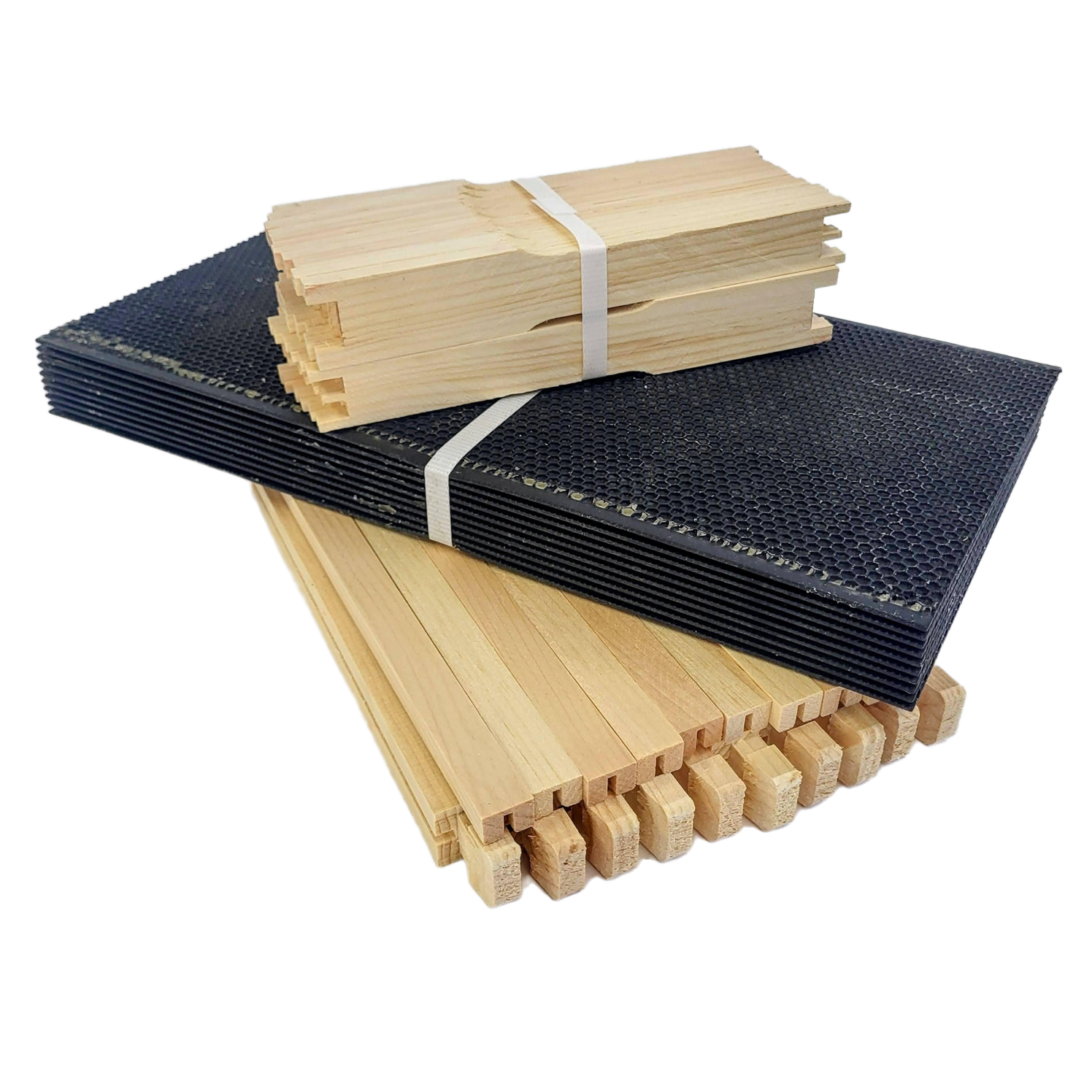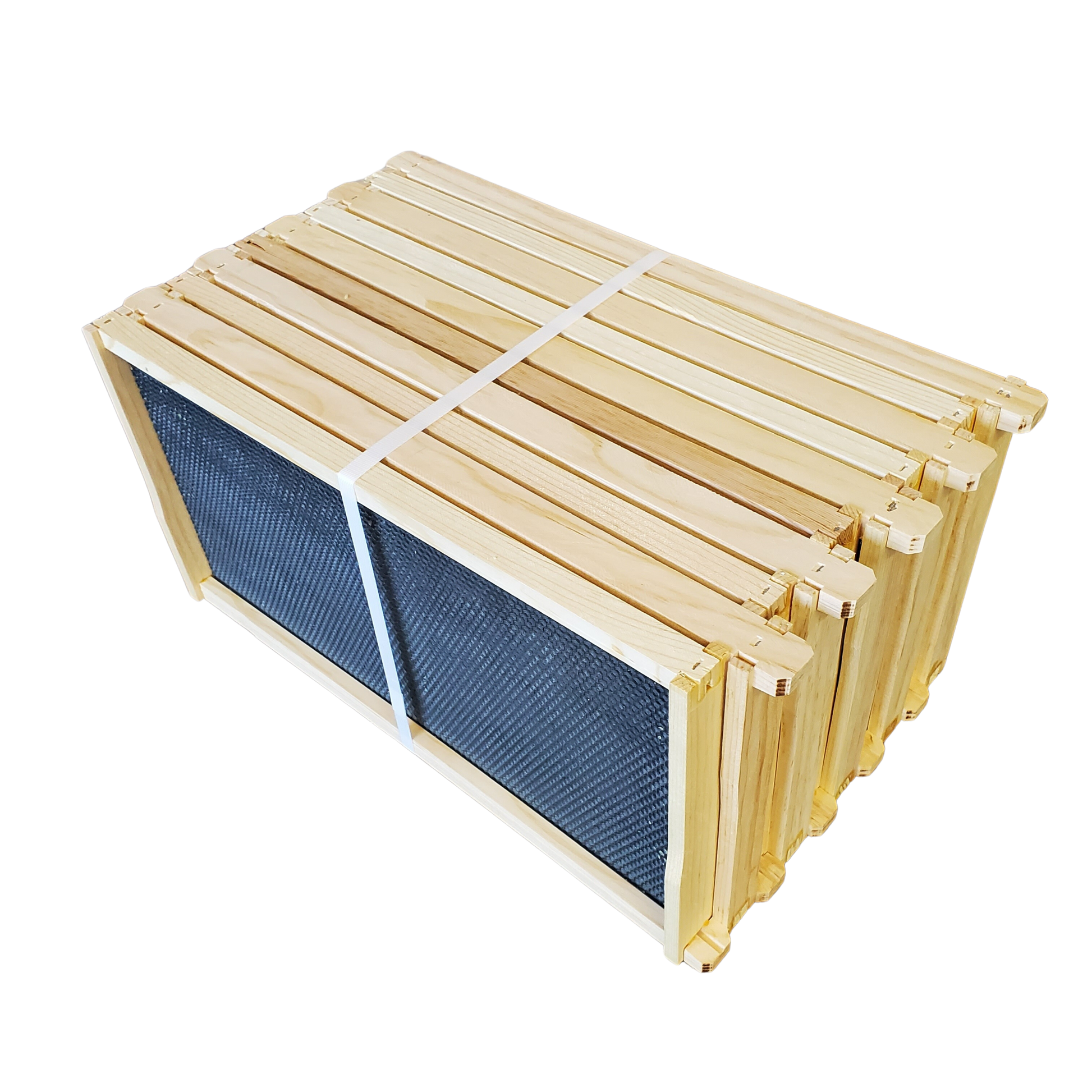 Each frame comes with 5 separate pieces, a top bar, a bottom bar, two sidebars, and a sheet of deep foundation that fits together with glue, nails, or staples to form the frame. The flexible foundation snaps into the frame after assembly without any extra tools. Each assembled frame serves as a place for the bees to build their comb. Each frame is designed to fit inside a deep box in just the right way so it can be easily removed and inspected by the beekeeper.