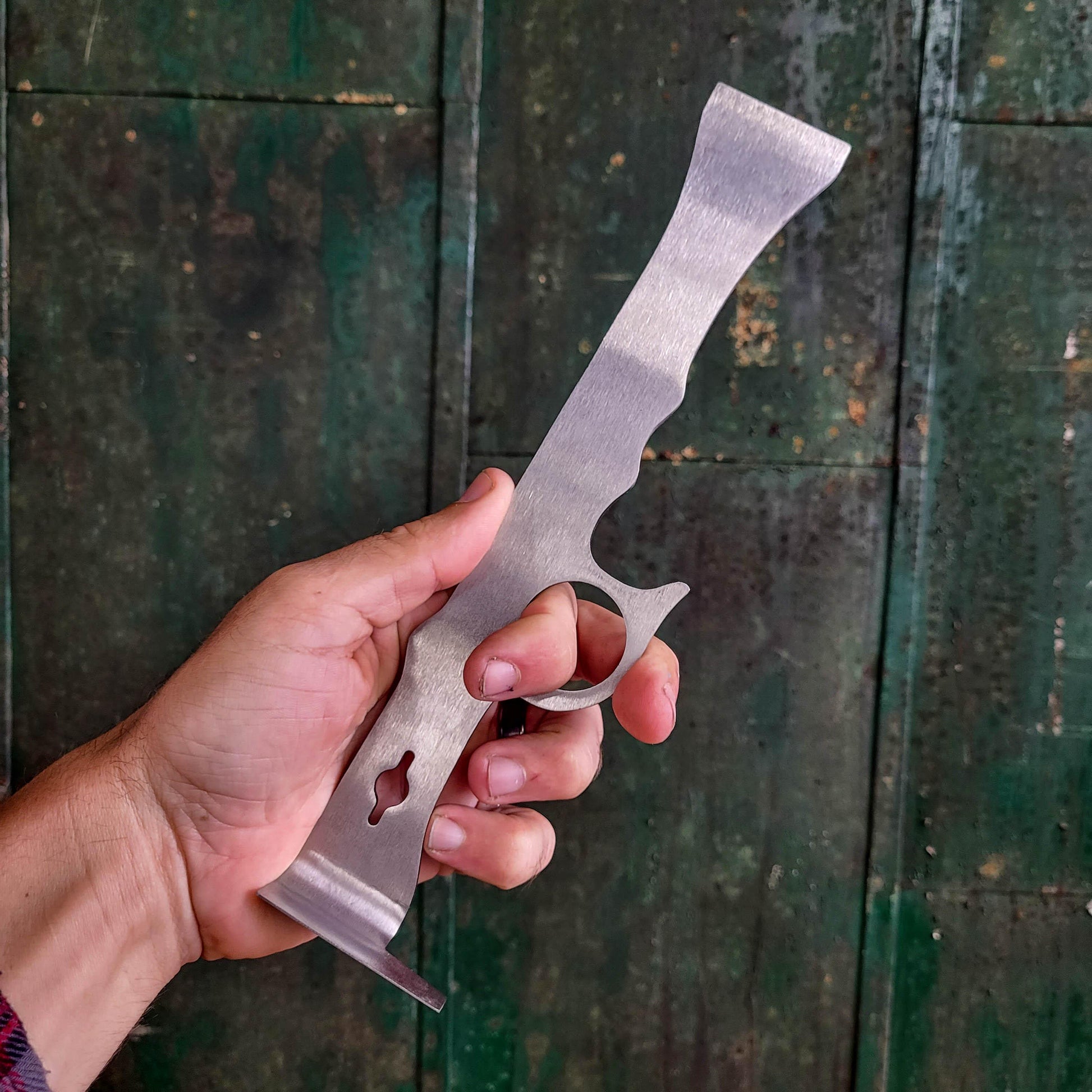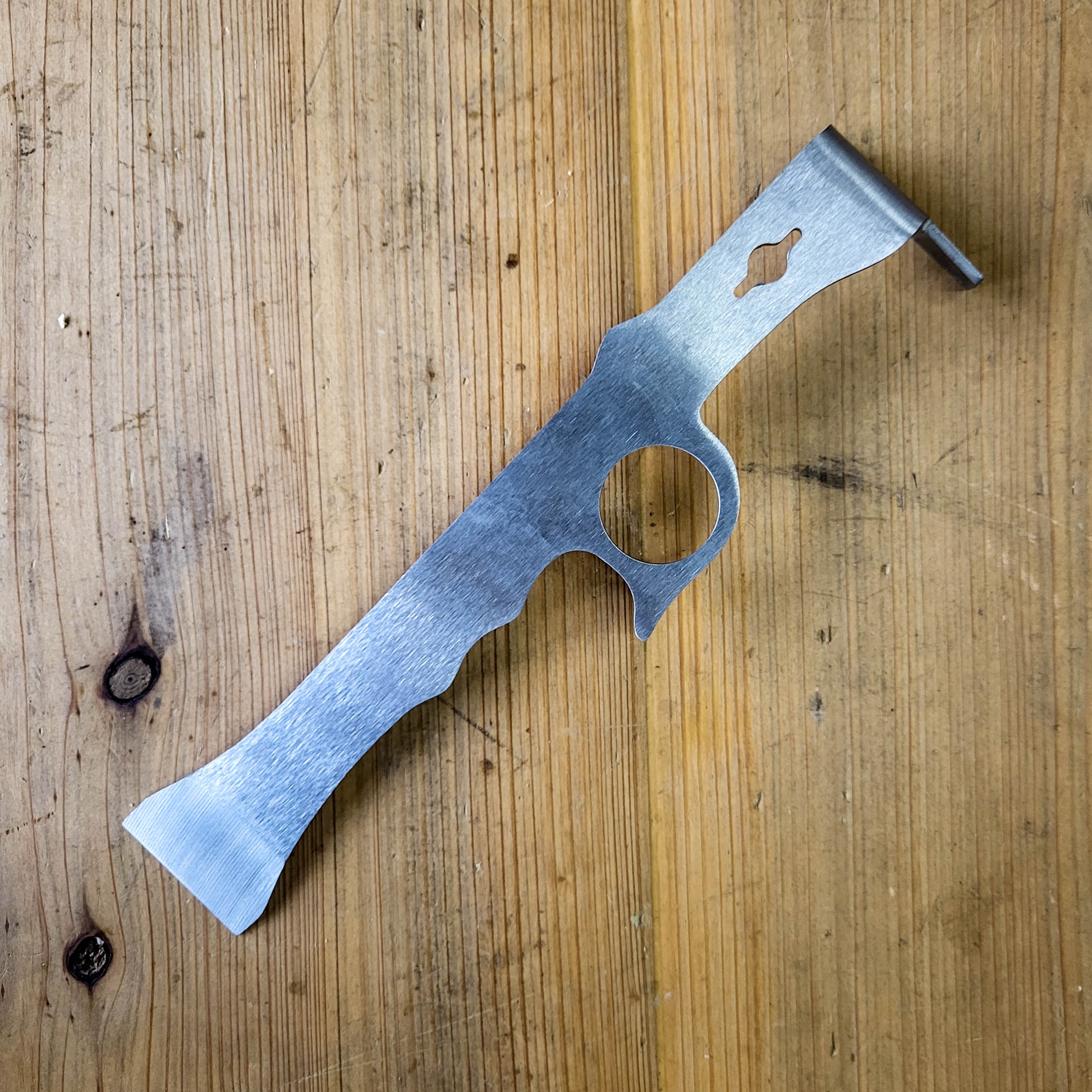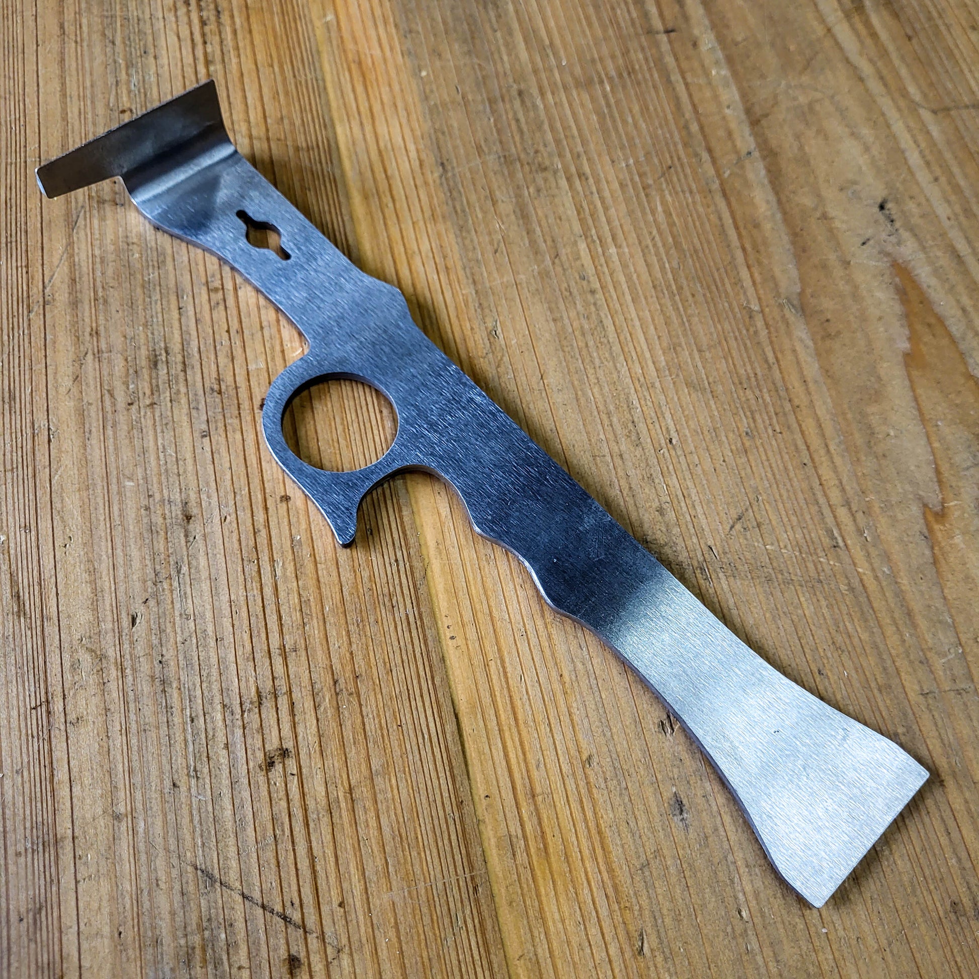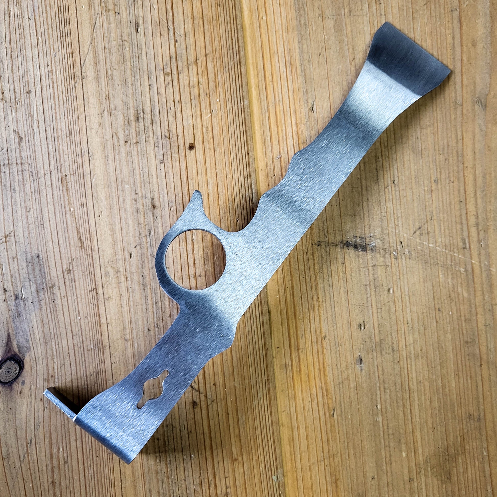 This is a J-hook hive tool with a unique look to it, as the hook has a broader edge to it compared to a normal J-hook hive tool.