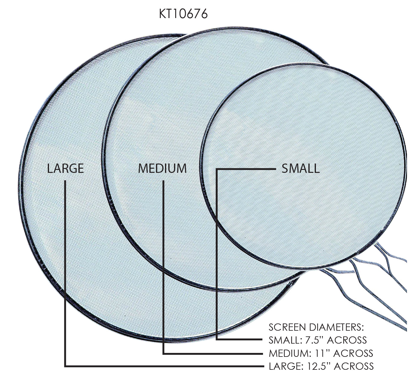 Tired of getting grease everywhere while you fry your favorite foods? Cook safely and save your stovetop from unsightly cooking splatters with this set of mesh splatter cooking guards. Constructed of finely woven mesh with a durable steel frame, coupled with a sleek handle, this cooking splatter guard in a set of 3 will ensure you never get splattered and burned by sizzling cooking sauces or piping hot liquids and oils. A perfect way to reduce oil splatters while frying and baking, you have up to 3 sizes to choose from to cover your cookware. Unlike lids that block your cooking progress, these splatter screens let you see inside without having to remove it from your pot or pan. The set comes complete with a small, medium, and large to accommodate all types of pots and pans. Fits in 8 inches, 10 inches and 12 inches frying pans. COLOR: Silver