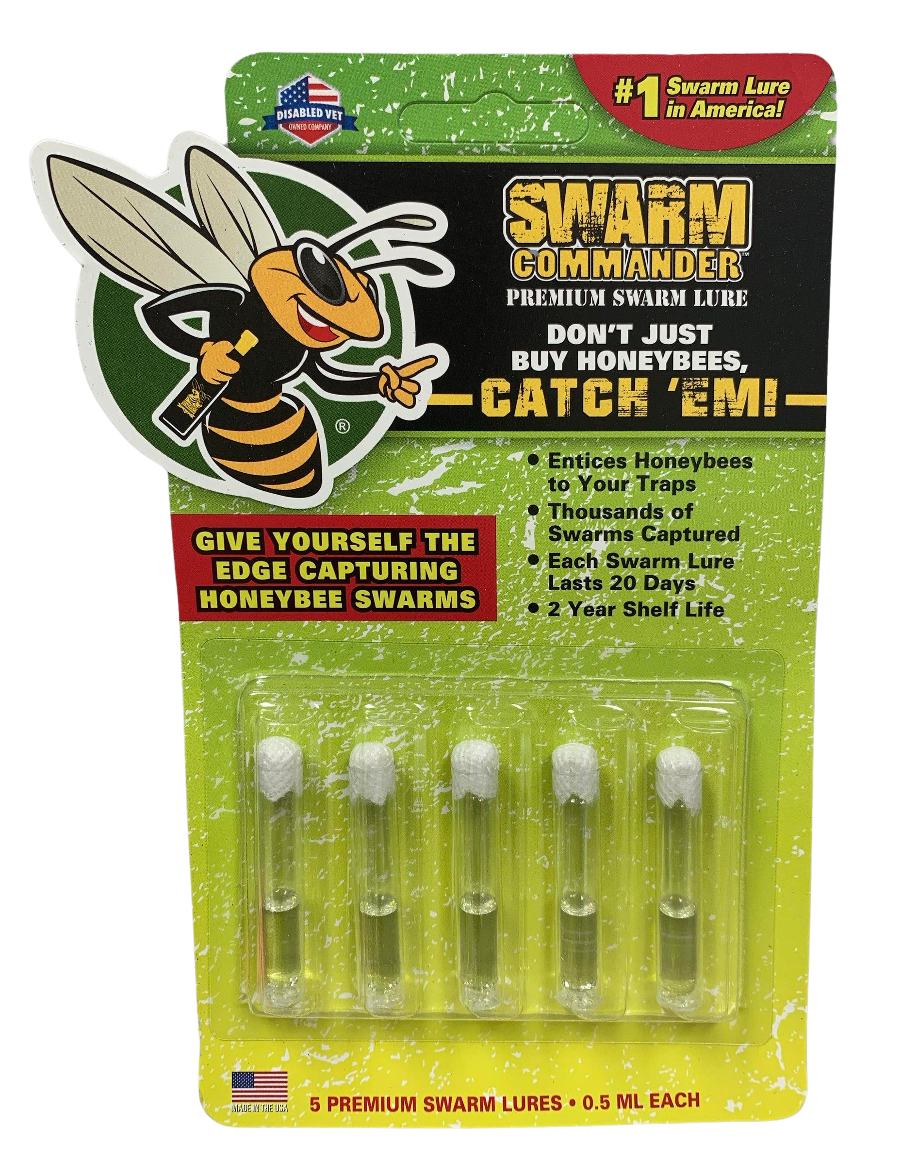 Effortlessly attract honeybee swarms with the Swarm Commander Crush Vials 5-Pack. Pre-charged with Swarm Rustler, these vials make baiting swarm traps simple and effective. The pheromone formula mimics the queen bee Nasonov pheromone, naturally drawing scout bees to your trap. Designed for long-lasting performance, these crush vials ensure that your swarm trap stays active for weeks, offering a reliable and efficient way to establish new bee colonies.