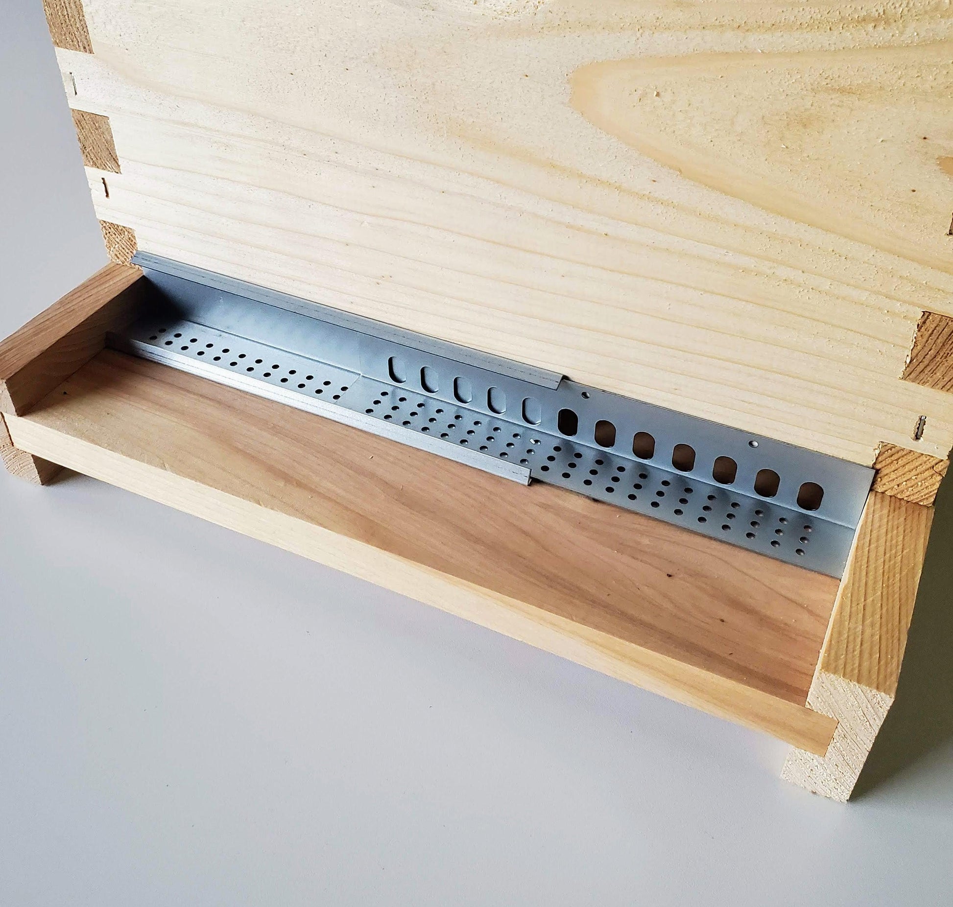 Based on the research of Tom Seeley, we developed this Universal and Reversible Metal Entrance Reducer to the correct size entrance bees prefer naturally. Read More about this design and entrance reducers. The total entrance of the colony is what wild bees prefer, helping beekeepers work with the bees and not against them.